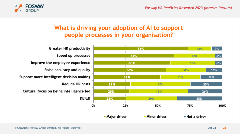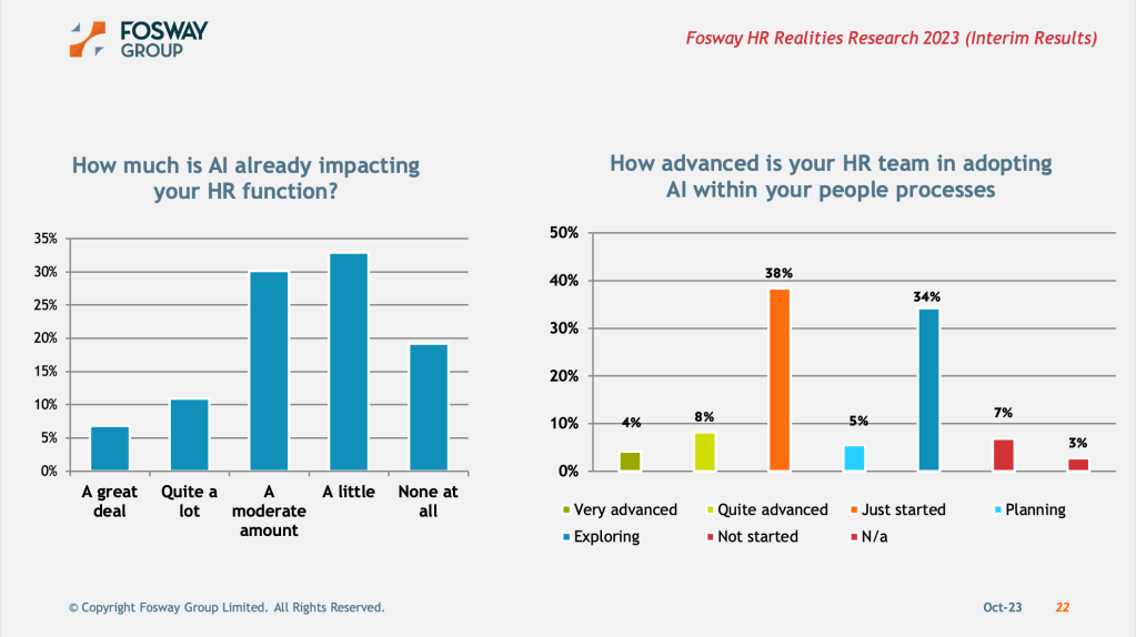 Selon Fosway, 60% des répondants prévoient d’augmenter l’utilisation de l’intelligence artificielle (IA) dans leurs processus RH. Or, moins de 20% ont une utilisation effective de cette technologie. Et seulement 38% commence tout juste à adopter l’IA dans les processus RH.