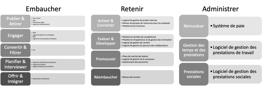 Par exemple, pour la fonction RH, le SIRH est doté d’un ensemble de logiciels dans 3 domaines applicatifs.