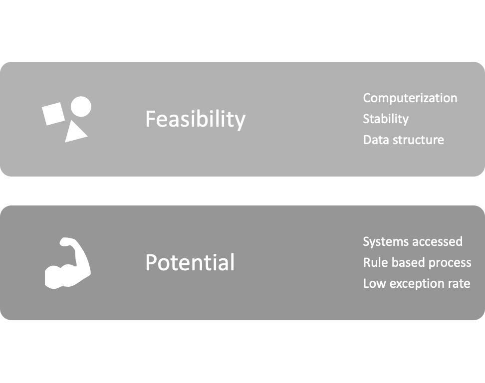 In summary, the automation feasibility can be estimated by questioning the computerization, the stability and the data strucutre of the process.